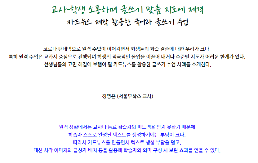 둘째, 원격 학습 상황에서는 교사나 동료 학습자의 피드백을 받지 못하기 때문에 학습자 스스로 완성된 줄글 텍스트를 생성하기에는 부담이 크다. 따라서 카드뉴스를 만들면서 텍스트 생성 부담을 덜고, 대신 시각 이미지와 글상자 배치 등을 활용해 학습자의 의미 구성 시 보완 효과를 얻을 수 있다.