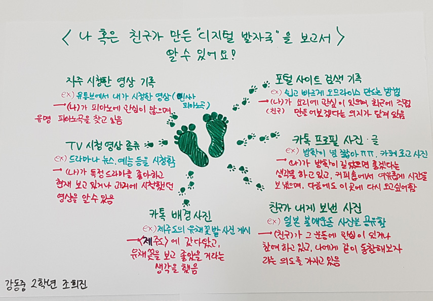 활발하게 SNS 활동을 하는 중학생들은 스스로 남긴 디지털 발자국이 수집된다는 사실에 긴장했습니다. 먼저 ‘요즘 내가 남긴 디지털 발자국이 무엇인지, 내 디지털 발자국이 나에 대한 어떤 정보를 제공하는지’ 생각했죠.