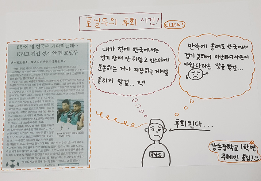‘선수의 건강이 우선이니 경기 출전하지 못한 것은 후회하지 않는다. 하지만 디지털 발자국의 중요성을 몰랐던 것은 후회한다. 내가 왜 런닝 머신 짤을 올렸지?’ 등 호날두 입장에서 후회하는 글을 쓰며, 학생들은 자신들의 발자국을 점검하는 듯 보였습니다.