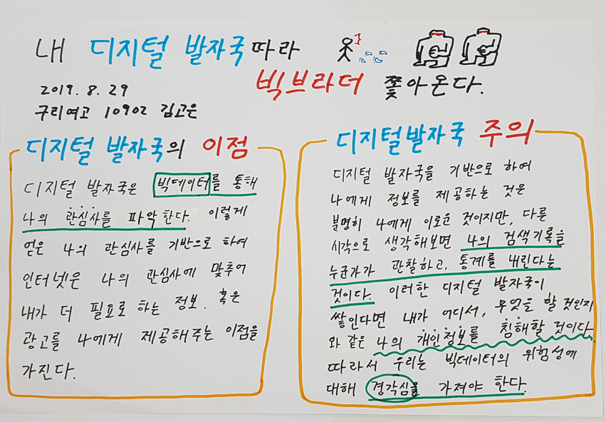 ①과연 빅데이터는 빅브라더(정보 독점으로 사용자를 관리, 감독, 통제하는 힘)가 될까요? 함께 생각해봤습니다. 고은이는 ‘디지털 발자국을 따라 빅브라더가 쫒아온다’며 디지털 발자국의 순기능과 역기능을 글로 표현했습니다[사진9].