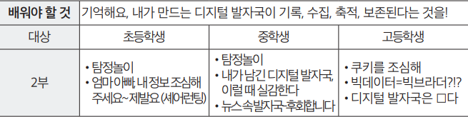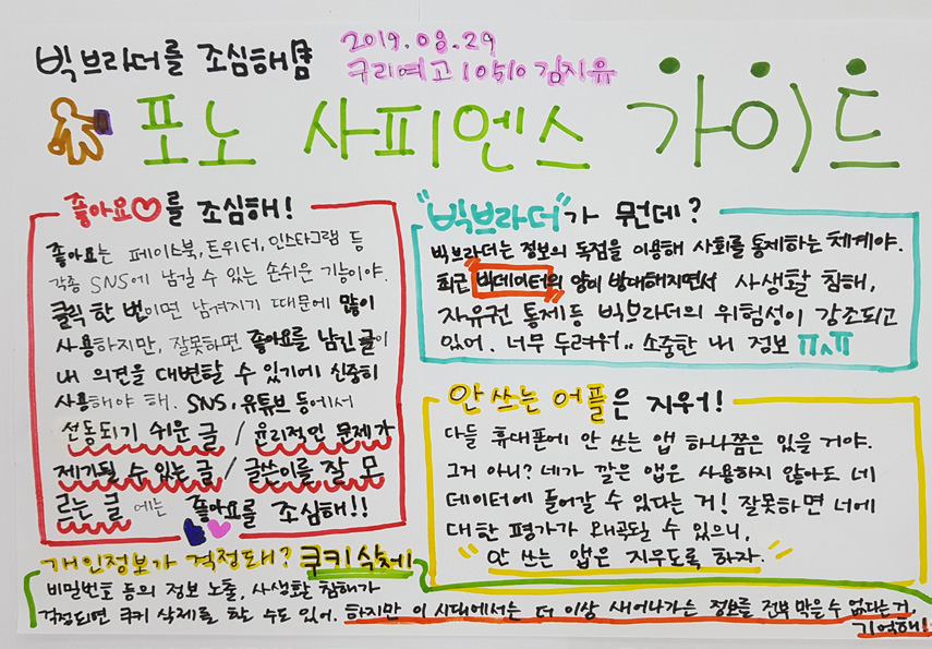 ②빅데이터화 하는 디지털 발자국이 무섭다고 디지털을 떠날 순 없죠, 시간을 거꾸로 되돌리지 않는 한 앞으로 디지털 환경은 점점 확대될 것이니까요. 스마트폰을 신체의 일부처럼 생각한다는 포노사피엔스4) 시대를 살아가는 10대에게 제시할 가이드라인을 만들어봤습니다. 지유는 ‘좋아요 누를 때 조심할 것, 안 쓰는 어플을 지울 것, 쿠키를 삭제할 것’ 등을 제시하더군요[사진10].