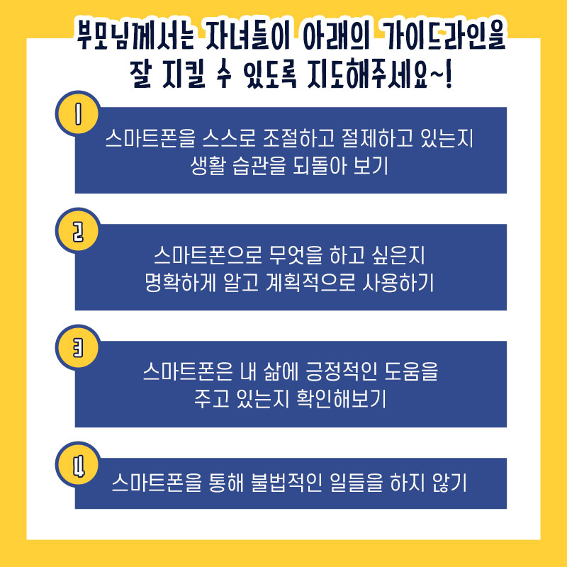 부모님께서는 자녀들이 네가지 가이드라인을 잘 지킬 수 있도록 지도해 주세요!