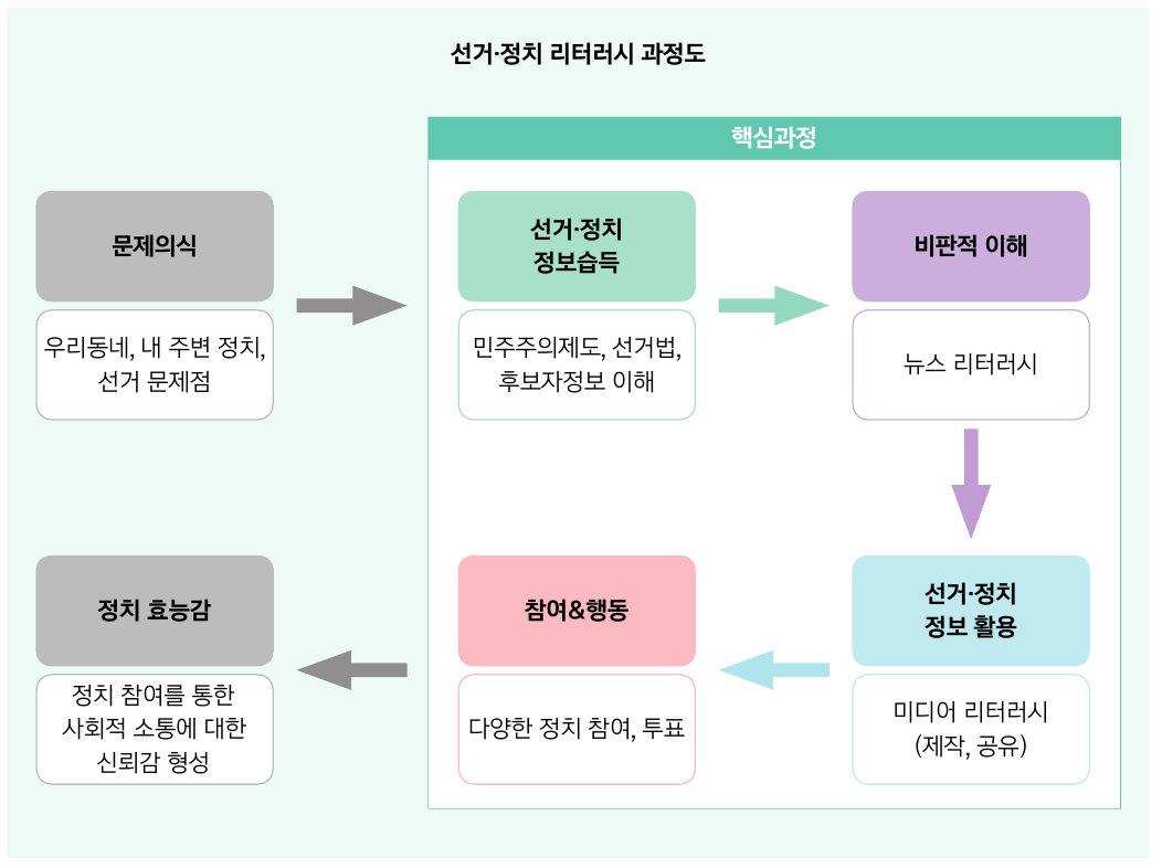 ‘선거·정치 미디어 리터러시’의 최종 목적지는 위의 모든 과정을 통해 내가 속한 사회를 바꿀 수 있다는 ‘정치 효능감’을 갖는 것이다. 핵심 과정을 통해 적극적으로 정치에 참여하려는 태도가 형성되는 것이 민주주의 시민성의 완성이라고 할 수 있다.