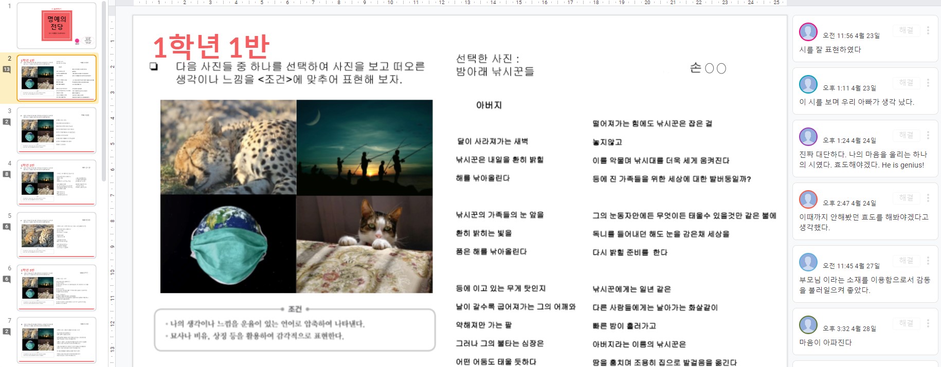 시(詩) 수업이 끝나고 시 창작 과제를 낸 적이 있다. 개별 과제로 제시해도 되지만 일부러 프레젠테이션 각 장에 번호를 매겨 자기 번호가 쓰인 페이지에 시를 쓰게 했다. 자기 작품을 쓰면서 친구들의 작품도 볼 수 있게 한 것이다. 완성된 작품 중 잘된 작품을 뽑고 각 반의 우수 작품을 모아 명예의 전당을 만들어 온라인으로 게시했다. 학생들은 모든 반 학생들의 우수 작품을 보면서 잘했다고 생각하는 작품에 칭찬 댓글을 달았다. 교실 수업에서 이런 과제는 어떻게 진행할 수 있을까? 잘된 작품을 뽑아 복도에 게시한 후 오다가다 감상하도록 하거나 포스트잇에 칭찬의 말을 적어 붙이게 할 수 있다. 그러나 온라인으로 진행하는 것보다 시간과 노력이 훨씬 더 많이 들고 과제 집중도도 떨어진다. 시공간을 초월한 온라인이었기에 여러 반의 우수작을 한눈에 볼 수 있었던 것이다.