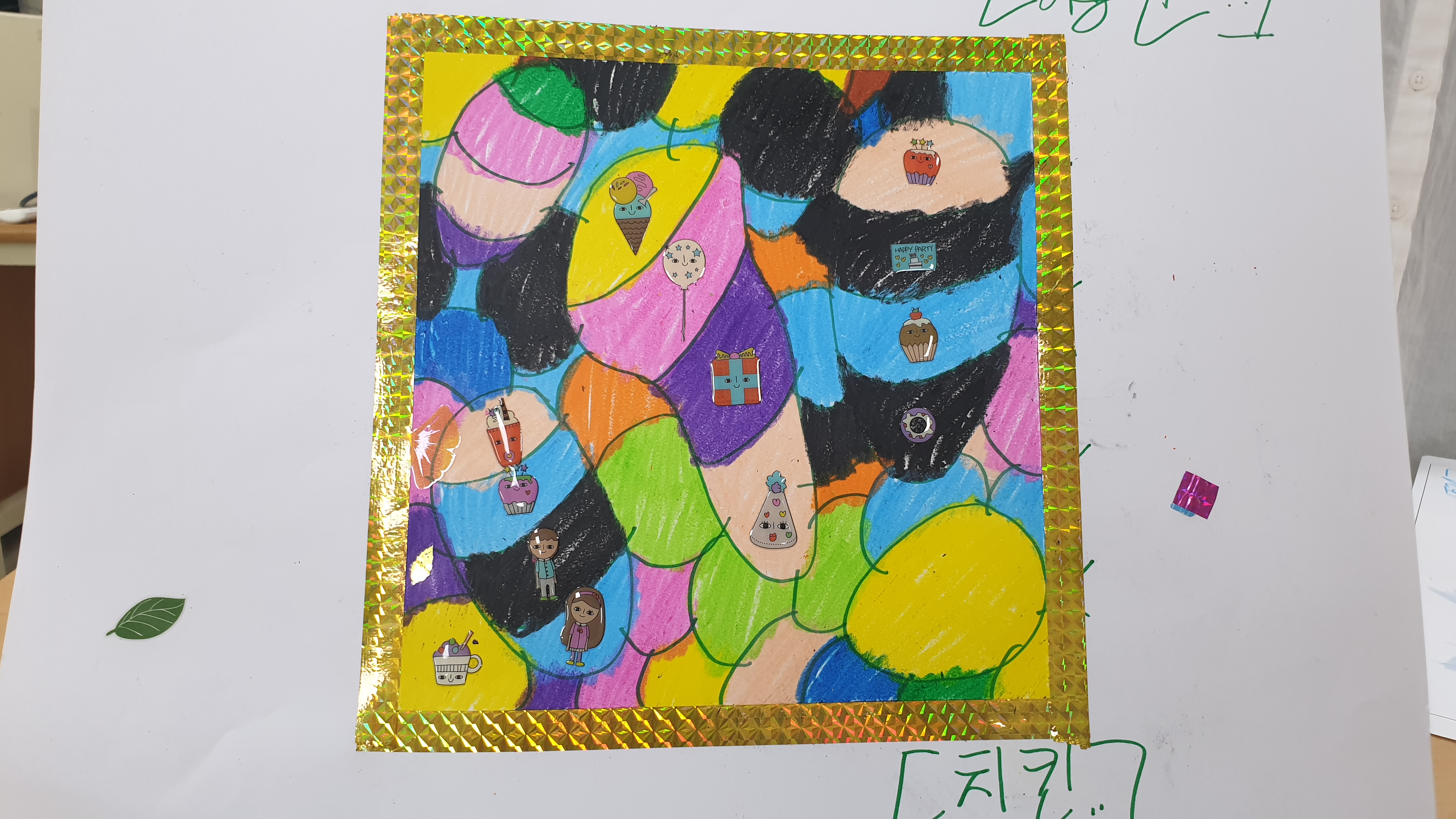 먹방 팀의 작품은 흥미진진했다. 치킨을 나타내는 황금색으로 테두리를 장식하고, 다양한 색깔의 치킨이 등장했다. 치킨을 다양한 색으로 칠한 이유를 물었지만 아쉽게도 답을 듣지는 못했다. 채널 아트에는 다음에 먹고 싶은 음식인 피자를 그렸다.