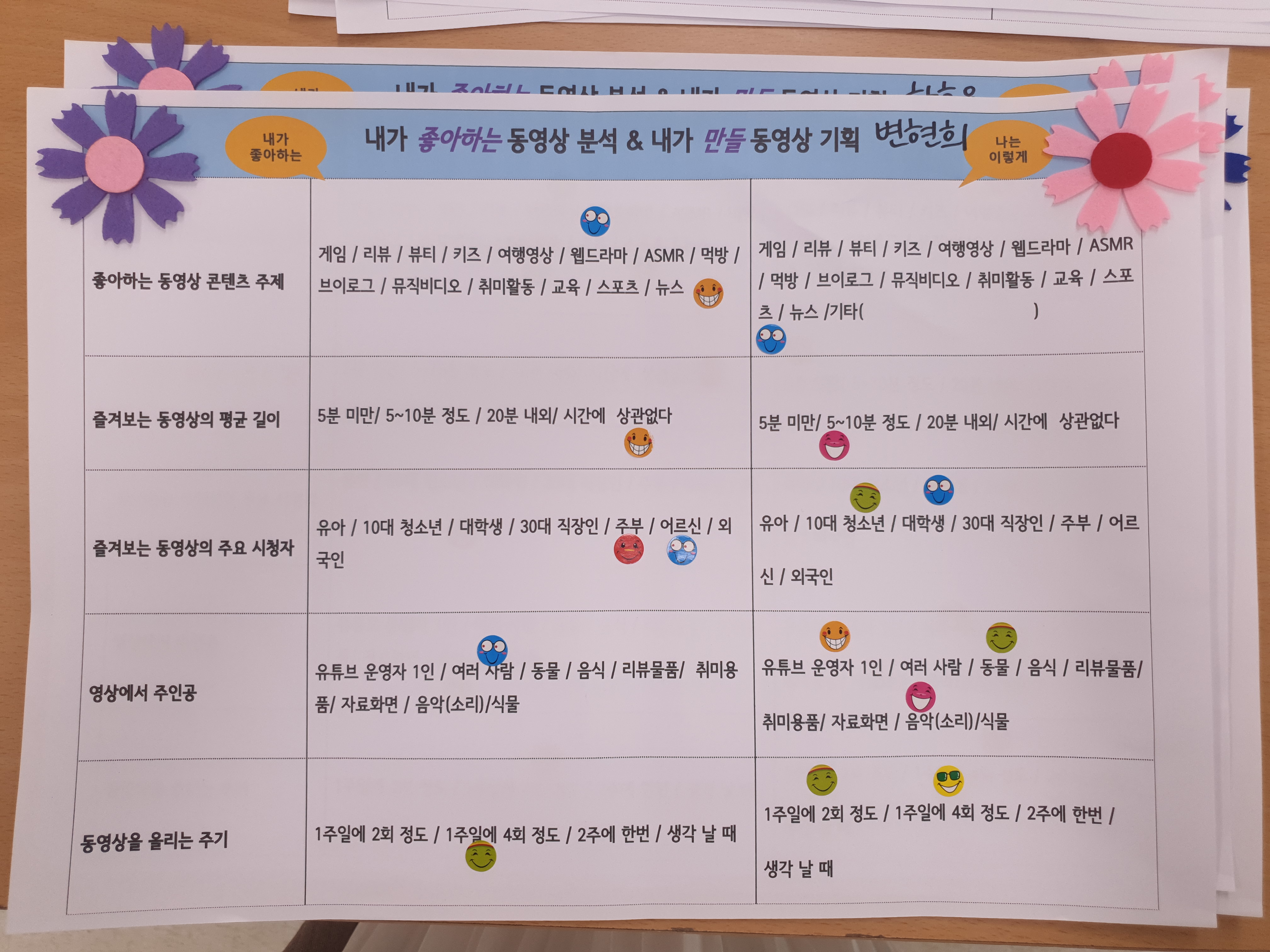 모두 열성적으로 유튜브를 소비하고 있었다. 하루 평균 5~10분 정도 유튜브를 시청하고 있었지만, 때론 시간에 상관없이 좋아하는 콘텐츠를 하루 종일 시청할 수도 있다고 말하는 이도 있었다. 이어서 활동지를 나누어주었다. 활동지에는 지금까지 나눈 대화를 기준으로 ‘내가 좋아하는 동영상 분석’란에 스티커를 붙이도록 했다. 교육생의 연령대가 다양한 만큼 각자의 취향에 따른 선호도 역시 다양하게 나왔다.