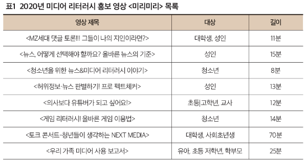 2020년에 제작한 미디어 리터러시 영상은 댓글 문화, 미디어 리터러시, 뉴스 리터러시, 게임 리터러시, 유튜브, 유아 미디어 이용 습관 등 조금 무거운 내용을 재미있는 방법으로 구성해 누구나 쉽게 접할 수 있도록 기획했다. 많은 정보를 전달하고 교육적 목적을 달성하면서도 홍보 효과 극대화하는 두 마리 토끼를 쫓기 위해 가볍고 재미있게 만들되, 영상의 편수를 늘리는 방향으로 내용을 보완하려고 노력했다.
