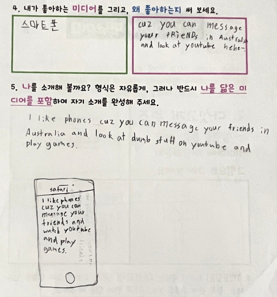 우선 미디어가 무엇인지부터 설명이 필요했다. “미디어란 바로 우리야. 내가 입고 있는 옷, 다니는 학교, 그리고 학교라는 공간에서 선생님과 공부하는 교과서, 학교생활을 잘 하기 위한 소통과 우정을 나누는 스마트폰.” 설명을 듣고 아이들은 자신과 닮은 미디어를 생각해 보았다. 이야기를 잘 하고 많은 정보를 알고 있어 ‘카톡’과 닮았다는 아이, 아는 것이 많아 ‘네이버’를 닮았다는 아이도 있었다. 다문화 가정 아동인 온누리 학생은 스마트폰으로 호주 사는 친구에게 메시지를 보내고 유튜브를 볼 수 있어서 스마트폰이 좋다고 했다. 나를 닮은 미디어 소개 역시 동일했다. 현대인이 미디어에 빠져 사는 모습은 이미 국적을 초월해 서로 비슷했다. 아이들 스스로 자신이 소중한 미디어 주체임을 인식하게 하고자 ‘나를 닮은 미디어’를 생각하면서 명찰을 만들어 보게 했다.