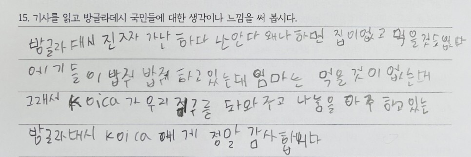 아이들이 사밥에게 놀란 일이 또 한 번 있었다. 필리핀에 이어 방글라데시의 기부 문화를 다루려 했으나 자료를 찾기가 쉽지 않았다. 그래서 방글라데시에 원조를 하고 있는 코이카(KOICA) 방글라데시 사무소의 조현규 소장에 대한 인터뷰 기사를 준비했다. “재작년 방글라데시가 90만 로힝야 난민을 수용하는 과정을 가깝게 지켜보면서 뭉클했어요. 전 세계에서 가장 가난한 나라 국민이 없는 살림에 나눠가며 난민을 먹였거든요.” 나눔의 실천이 경제 수준과 무관하다는 이야기를 시작으로 방글라데시인의 특별한 나눔을 소개한 기사였다. 이때 부모님이 모두 방글라데시 출신인 사밥 학생이 활동지를 다 작성하고 나에게 신호를 보냈다. 먼저 발표하고 싶다는 의미였다. 아직 활동지를 작성 중인 아이들이 많아 조금만 기다리자고 말했다. 사실 나도 사밥의 이야기가 듣고 싶었다. 드디어 사밥 학생이 발표를 시작했다.