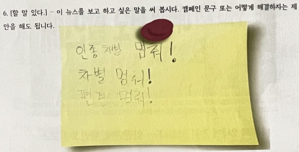 다문화 뉴스 읽기 첫 수업의 주제는 ‘혐오’였다. 우선 혐오를 다룬 뉴스 두 개를 준비했다. 우리나라 교민이 미국에서 혐오의 대상이 되어 테러를 당한 뉴스와, 우리나라에서 다문화 2세를 향해 코로나 관련 혐오 발언을 한 사람을 인권위가 고소했다는 뉴스였다.