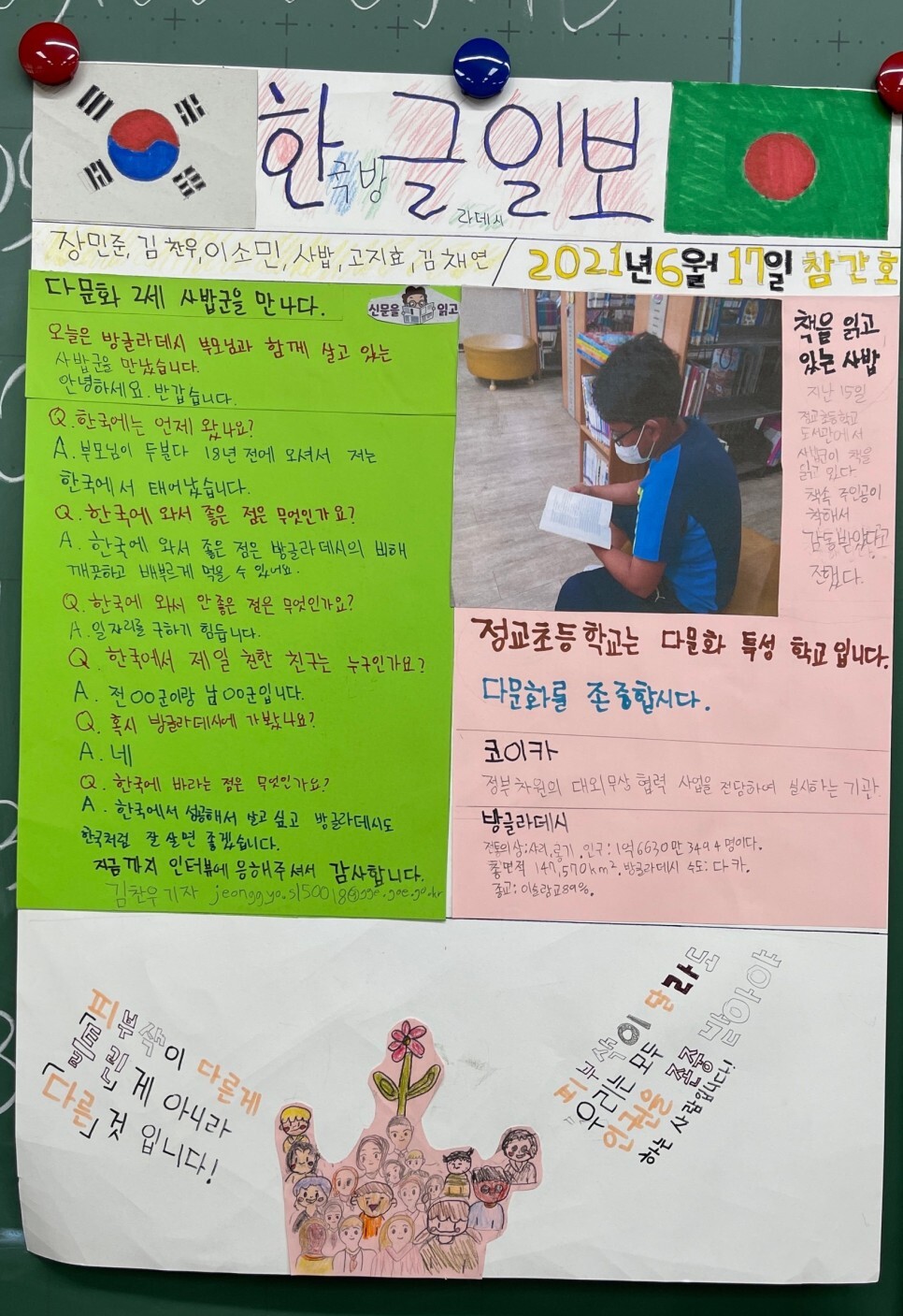 그리고 마지막 활동으로 아이들과 약속했던 신문 제작을 시작했다. 신문의 주제는 ‘다문화 가정’이었다. 학교 이름을 따서 정팀·교팀·초팀으로 모둠을 나눈 뒤, 온누리와 김요한, 그리고 사밥 학생을 주축으로 모둠을 구성했다.