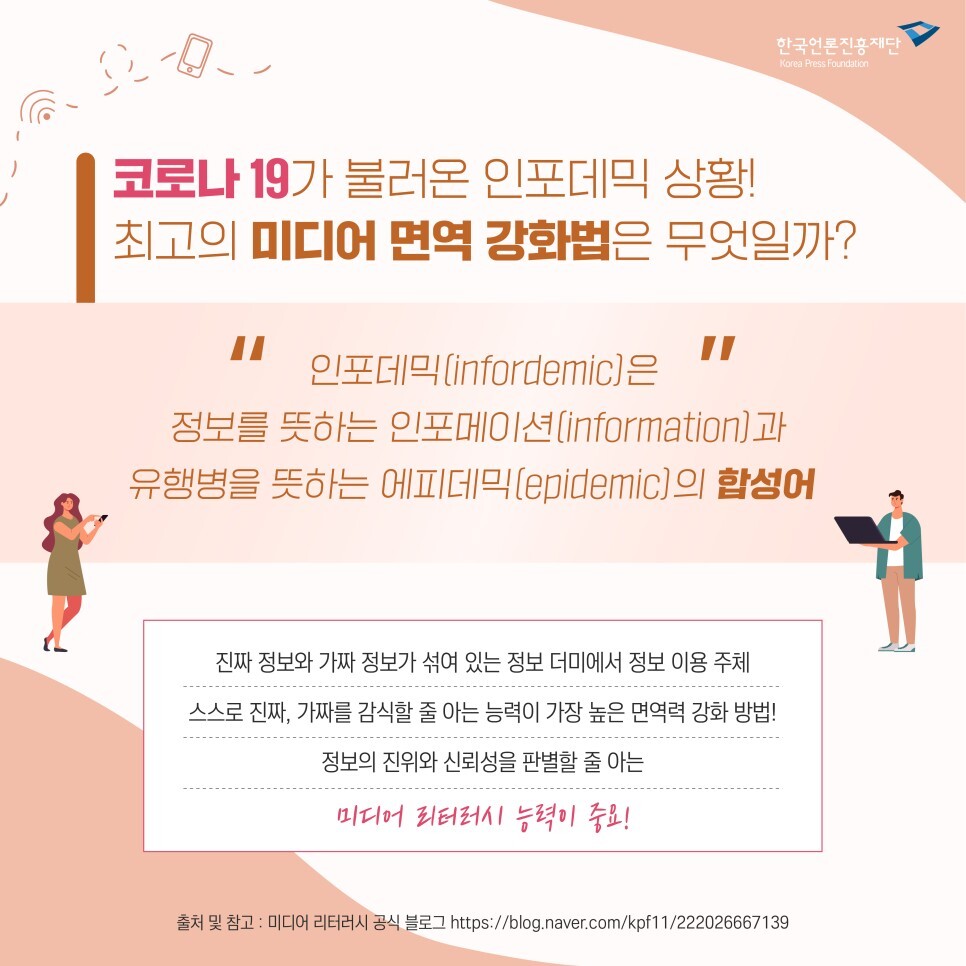 안녕하세요, 한국언론진흥재단입니다. 이제는 많은 분들께서 미디어 리터러시에 대하여 이제는 잘! 알고 계시지요? 올바른 미디어 사용을 위해 미디어 리터러시에 대하여 다시 한번 점검해 보
