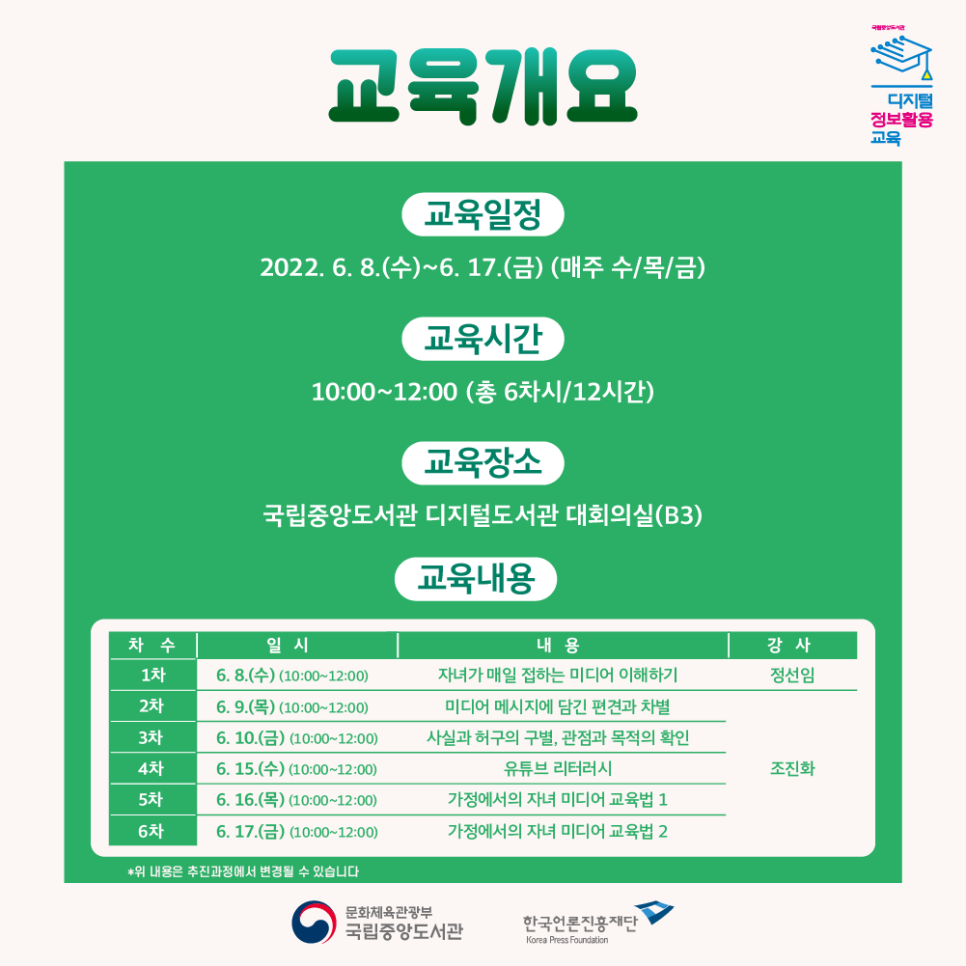 초등학교에 들어간 아이가 휴대폰을 가지고 다니며 게임이나 ‘카톡’을 하는 친구를 부러워했다. 이런 아이를 보며 과연 또래 집단과 어울리기 위한 미디어 기기 이용을 부모로서 어디까지 허용하고 관여해야 할지 고민이 많아졌다. 그러던 참에 이번에 한국언론진흥재단에서 주최하는 ‘학부모를 위한 미디어 리터러시 아카데미’가 국립중앙도서관에서 열린다는 소식을 듣고 반가운 마음으로 신청했다. 2022년 6월 8일부터 17일까지 총 6차시에 걸친 미디어교육은 비록 짧은 과정이었지만 초등 자녀를 둔 학부모 입장에서는 직접 응용해볼 만한 유용한 팁을 얻을 수 있었다. 또 다함께 생각해볼 만한 부분도 많았다.