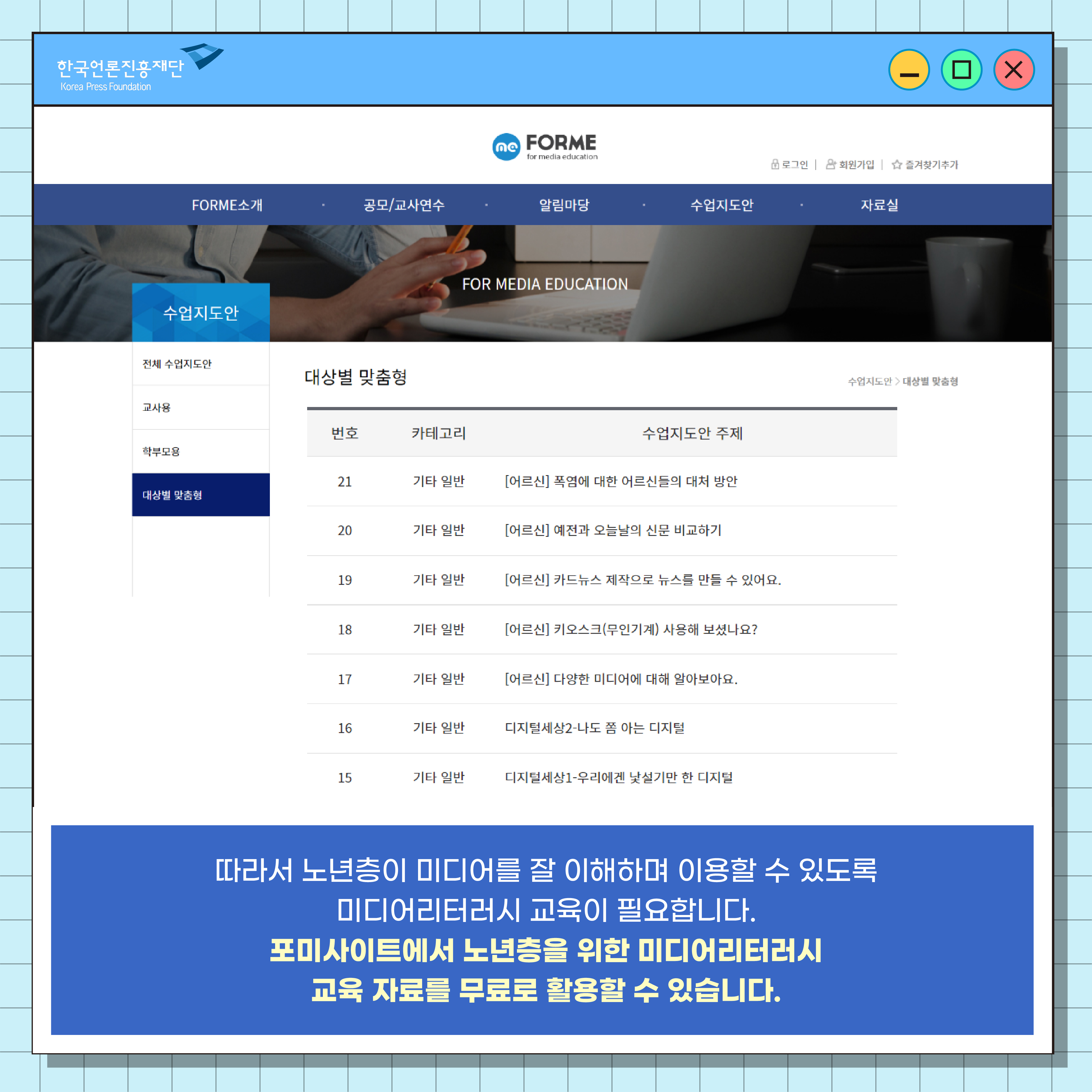 노년층의 건강한 미디어 사용이 확대되기를 바랍니다.