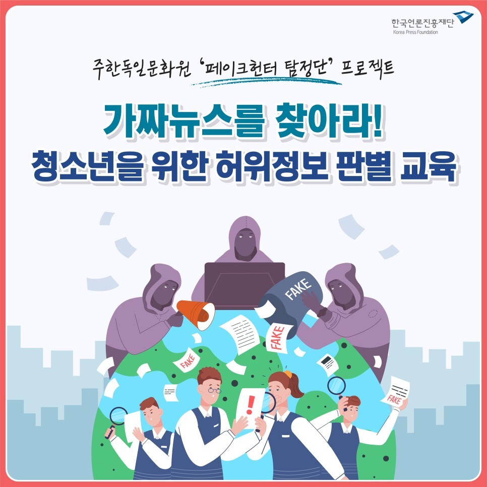 한국에서 스마트폰 또는 태블릿 없는 삶은 상상하기 어렵다. 스마트폰이 반드시 필요한 이유는 각자 다를 수 있지만, 한 가지 공통된 점은 스마트폰이 우리 모두에게 매우 중요한 삶의 동반자와 같다는 사실이다. 우리는 매일 소셜 미디어에 접속해 사진, 비디오, 텍스트 등 다양한 형태의 정보와 뉴스를 소비하고, 또 생산한다. 특정 정보를 얻기 위해 스마트폰을 꺼내들었다가, 목적과는 다르게 여기저기서 밀려오는 정보의 홍수 속에 빠져 몇 시간을 흘려보내는 일도 흔하다. 그러다 보니 일상 속에서 ‘거짓’과 ‘진실’을 구별하지 못하는 상황 또한 빈번하게 발생한다. 주한독일문화원에서는 가짜뉴스에 무방비하게 노출되어 있는 청소년들이 이러한 상황에 잘 대처할 수 있도록 돕기 위해 2022년도부터 ‘페이크헌터(FakeHunter) 탐정단’이라는 교육 프로그램을 한국 청소년에게 제공한다.