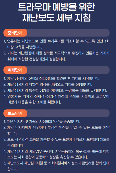 ‘트라우마 예방을 위한 재난 보도 세부 지침’에서는 준비-취재-보도 단계별로 각각 발생할 수 있는 트라우마를 최소화하고 회복을 지향하기 위한 구체적 방안을 담고 있다.