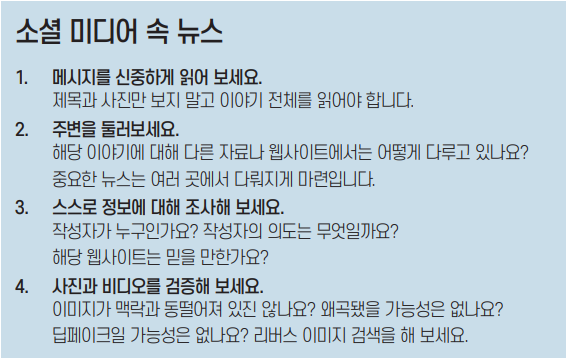 그들이 똑같은 거짓말을 수백만 번 마주치면, 그 거짓말은 사실이 되고 친구들과 공유하게 된다. 청소년은 소비자일 뿐만 아니라 소셜미디어상의 정보 제공자이기도 하다. 신뢰하는 사람으로부터 얻은 정보에 비판적이기 어렵다는 사실을 기억한다면, 왜 소셜미디어에서 공유되는 정보는 특히 더 검증하기 어려운지 이해할 것이다.