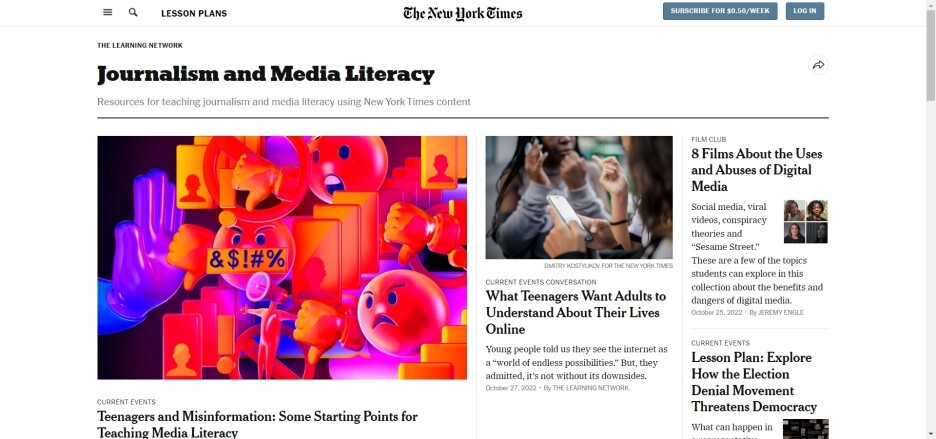 우선 섹션의 얼굴이라 할 수 있는 메인 기사를 살펴보자. “10대와 잘못된 정보: 미디어 리터러시를 가르치기 위한 시작점(Teenagers and Misinformation: Some Starting Points for Teaching Media Literacy)”이란 제목의 기사로서, 캐서린 슐텐(Katherine Schulten) 에디터가 썼다. 슐텐은 2006년부터 무려 17년 동안 꾸준히 청소년 미디어 리터러시 부문을 맡아온 에디터로 이 분야에 대한 <뉴욕타임스>의 지긋한 관심을 엿보게 해준다. 기사는 교사와 도서관 선생님이 학생에게 잘못된 정보(misinformation)와 허위정보(disinformation)2 문제를 어떻게 가르치고 이해하도록 도울 수 있는지 크게 5가지 방법을 제시하는 게 뼈대이다.