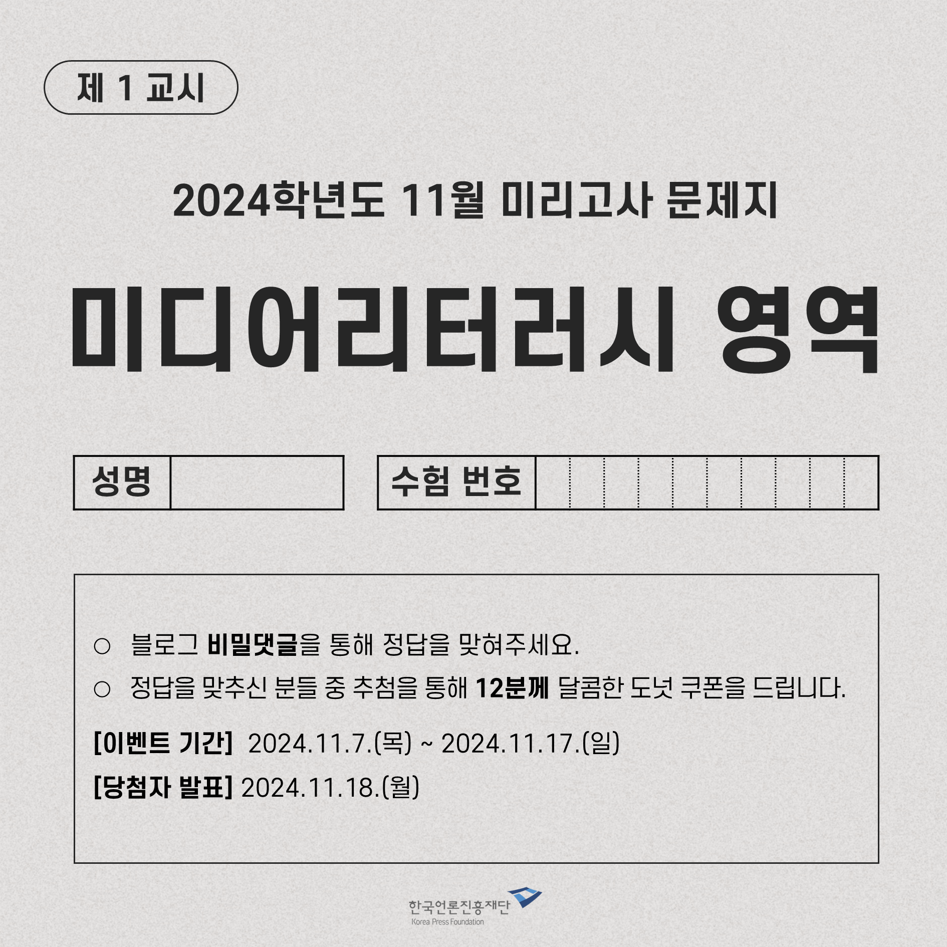 | [미·리데이] 제1회 미리고사 이벤트 당첨자 발표 (3) | 2024.11.18 |