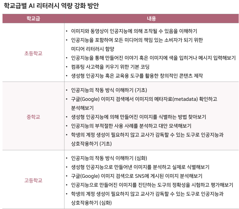 지침은 인공지능 교육 분야 비영리 민간단체인 ‘티치AI(TeachAI)’의 정의를 빌려, AI 리터러시를 “인공지능의 원리, 개념, 적용은 물론 인공지능을 사용하는 방법(예: 한계, 의미, 윤리적 고려 사항)을 포함하여 인공지능이 작동하는 방식과 관련된 지식, 기술, 태도”로 설명한다. 또한 AI 리터러시는 ‘21세기의 디지털 리터러시’이며, 미국에서는 AI 리터러시를 디지털 리터러시의 구성 요소로 포함하기 위한 정책들이 만들어지기 시작했음을 강조한다. 학습자가 인공지능에 대해 배우고 AI 리터러시 역량을 함양하도록 지원하는 것도 생성형 AI의 교육 현장 적용에서 중요하게 다뤄져야 하는 영역임을 시사한다. 학습자의 AI 리터러시 역량에 관하여, ‘공립학교를 위한 생성형 AI 적용의 권장 및 고려 사항’에서는 초·중·고 학교급별로 적용해볼 수 있는 차별화된 접근 방법을 소개하기도 했다.