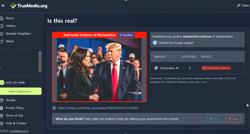 취재 과정에서 이런 의미 있는 방지턱을 발견했다. 미국 시애틀에는 올해 전 세계 선거를 대비해 만들어진 비영리 단체가 있다. 정치, 선거 관련 딥페이크 콘텐츠를 전문으로 탐지하는 비영리 단체 ‘트루미디어(Truemedia.org)’라는 곳이다. 이 단체는 미국 대선이 있었던 지난 11월 기준 하루 1,500개 이상의 딥페이크 콘텐츠를 탐지하고 사실이지 조작인지를 분석해 언론과 대중에게 무료로 제공했다. 사용자가 진짜인지 가짜인지 의심이 드는 콘텐츠의 링크를 트루미디어 홈페이지에 입력하면, 17개의 탐지 기술이 실시간으로 돌아가며 이것이 어떤 AI 기술을 이용해 생성된 것인지, 조작됐을 확률은 어느 정도인지 수치로 알려준다. 결과가 나오기까지 걸리는 시간은 단 몇 초에 불과하다.