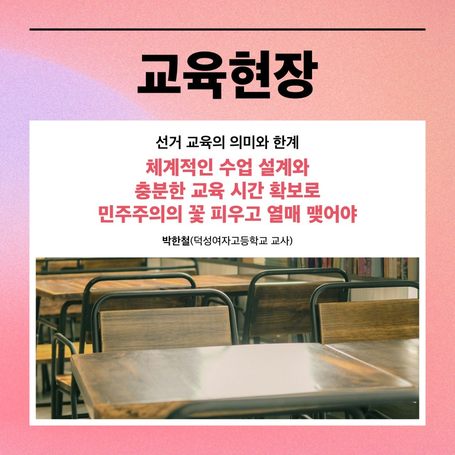 사랑스러운 우리 학생들은 미래의 주역이기도 하지만 현재의 시민이기도 하다. 그들의 정치 참여 능력을 함양시키는 것은 바로 우리나라의 민주주의를 성장시키는 일이기도 하다. 학생들이 정치와 선거에 무관심하지 않도록 효능감 있는 정치 참여의 장을 마련해주고, 정치적 현안과 정보들을 학생들의 관점에서 조사하고, 분석하고, 평가하고, 논쟁할 수 있도록 하는 체계적인 수업을 설계하고, 충분한 교육 시간을 확보해 숙의할 수 있도록 한다면 민주주의의 꽃은 물론 풍성한 열매도 함께 맺을 수 있는 미래가 열릴 것으로 생각한다.