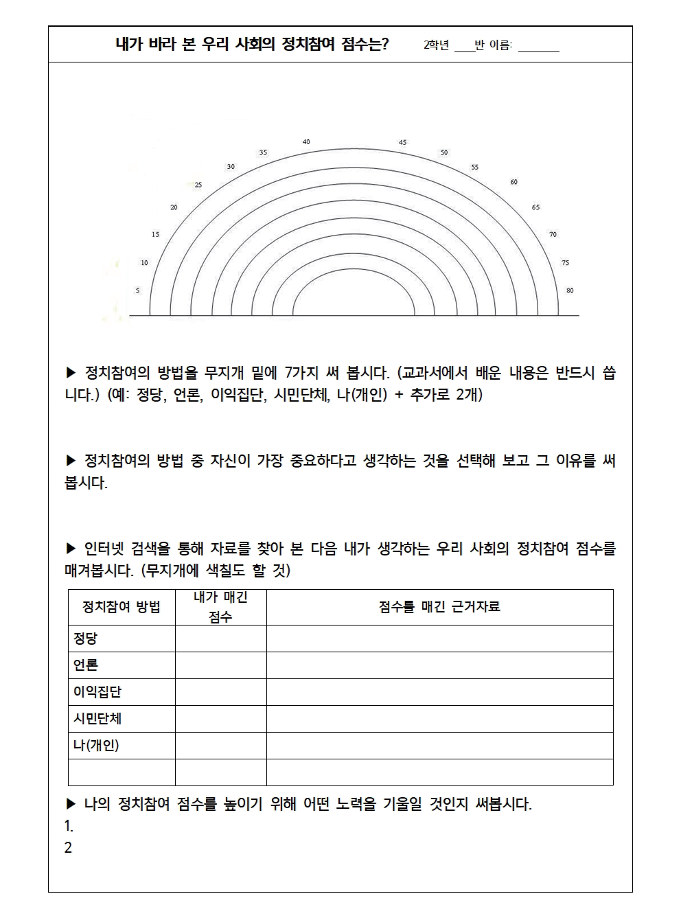 선거는 정치 참여에 대해 공부할 수 있는 좋은 기회이긴 하지만 선거가 일상적 행위가 아니다 보니 선거 교육은 지속성을 가질 수 없다. 그래서 선거가 없는 기간에는 정치 참여 교육으로 확장해 수업을 진행하고 있다. 대표적인 사례는 현대사회의 다양한 정치 주체들(국회, 행정부, 법원, 언론, 정당, 시민단체, 개인 등)의 활동 사항을 인터넷 뉴스 검색을 통해 점검해 보고 현재 제대로 정치 참여가 이루어지고 있는지 점수를 매겨보면서 진단해 보는 수업이다. 더불어 나의 정치 참여 점수를 높이기 위해 어떤 노력을 기울여야 할지도 함께 고민하는 내용도 담고 있다.