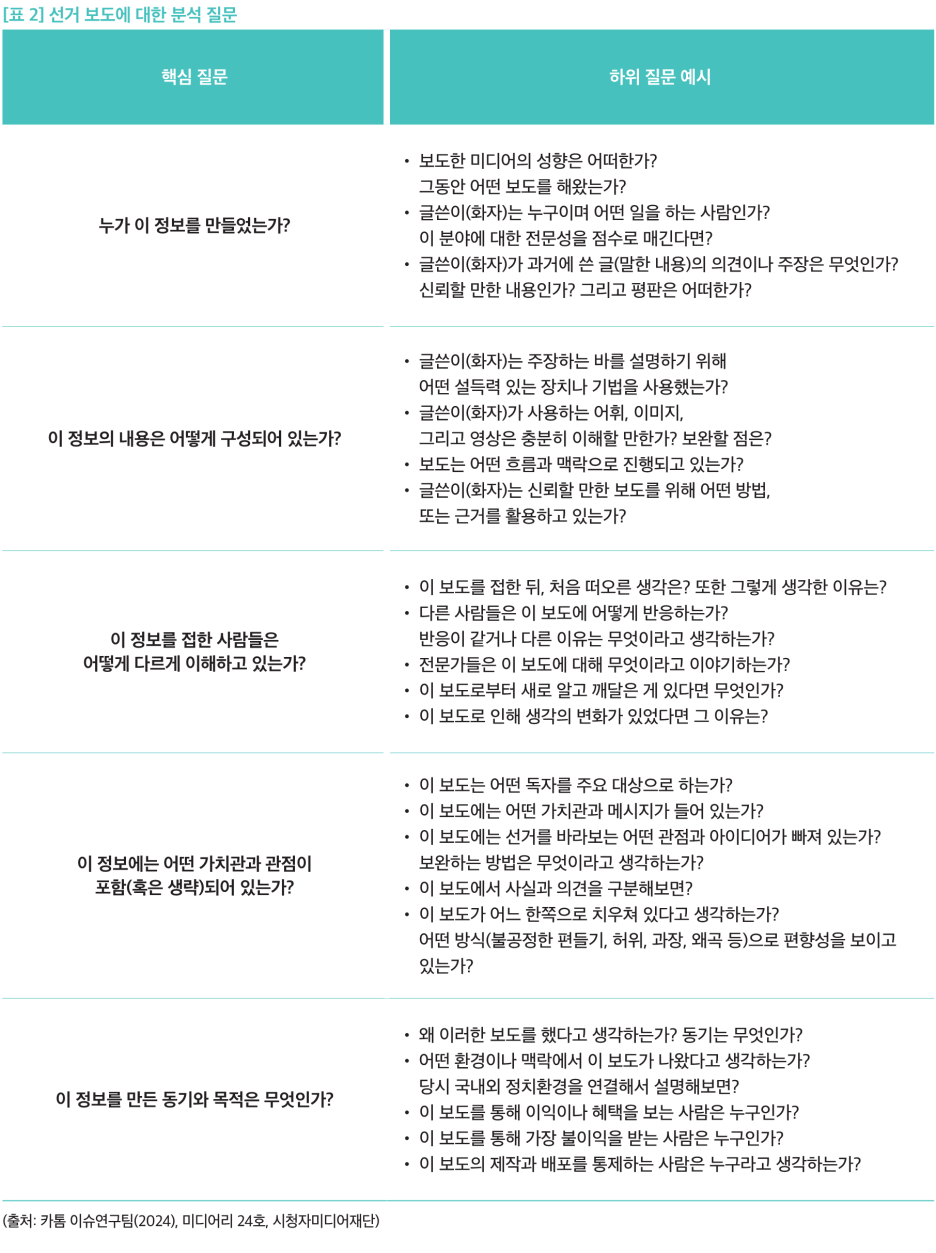 선거 관련 정보(정당이나 후보자에 대한 정보, 선거 여론조사 결과, 선거 보도, 정치 홍보, 후보자 토론, 후보자 유세, 선거공약집, 선거공보, 방송 연설, 선거제도 등) 선거의 안팎을 비판적으로 이해하고 분석하려면 다양한 관점에서 질문과 답을 해보는 것이 필요하다. 미디어에 따라 조금 다를 수 있지만 크게 다섯 가지 핵심 질문으로 요약할 수 있다. [표 2]의 핵심 질문에 근거해 각 미디어 콘텐츠에 맞는 하위 질문을 만들어본다. 학생들 스스로 조사하고 답하는 과정에서 미디어의 선거 보도에 대한 비판적 분석 능력이 자연스럽게 길러질 수 있을 것이다.