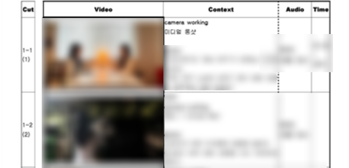 스토리보드 역시 카메라 앵글과 컷 구성, 필요한 VCR, 전달해야 할 주요 정보 등이