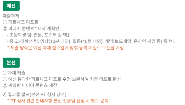 예선에서는 팩트체크 리포트와 미디어 콘텐츠 기획안을 제출하면 됩니다.